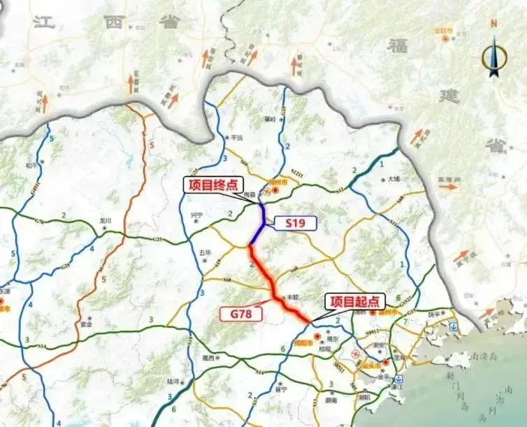 汕梅高速改扩建项目(汕昆高速公路揭阳新亨至梅州畲江段及梅汕高速公路梅州程江至畲江段改扩建项目)是广东省首条山岭重丘区高速公路改扩建项目,全长约88公里,途经揭阳市揭东区和梅州市丰顺县、兴宁市、梅县区,设计速度提升至100公里/小时,是广东省东北部南北货运重要通道,承担着粤东北地区综合枢纽(机场、铁路、港口)集疏运通道功能,预计2026年建成通车。